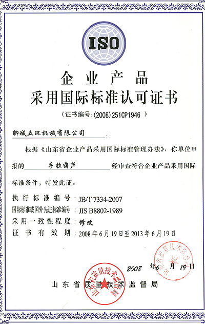 聊城五環(huán)機(jī)械有限公司在2008年6月19日獲得ISO企業(yè)產(chǎn)品采用國際標(biāo)準(zhǔn)認(rèn)可證書。