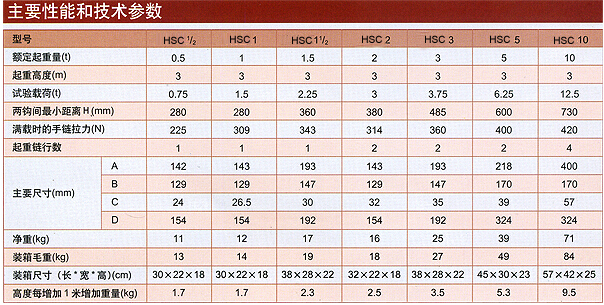3噸HSC型手拉葫蘆性能參數表